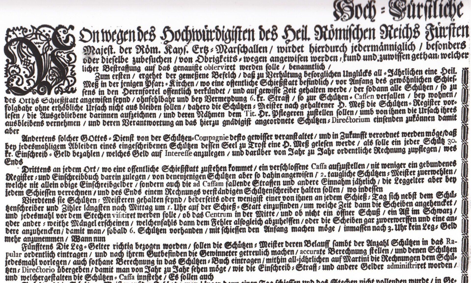 Oben fünf Paragrafen aus der 28 Vorschriften umfassenden Schützenordnung des Fürststifts Kempten