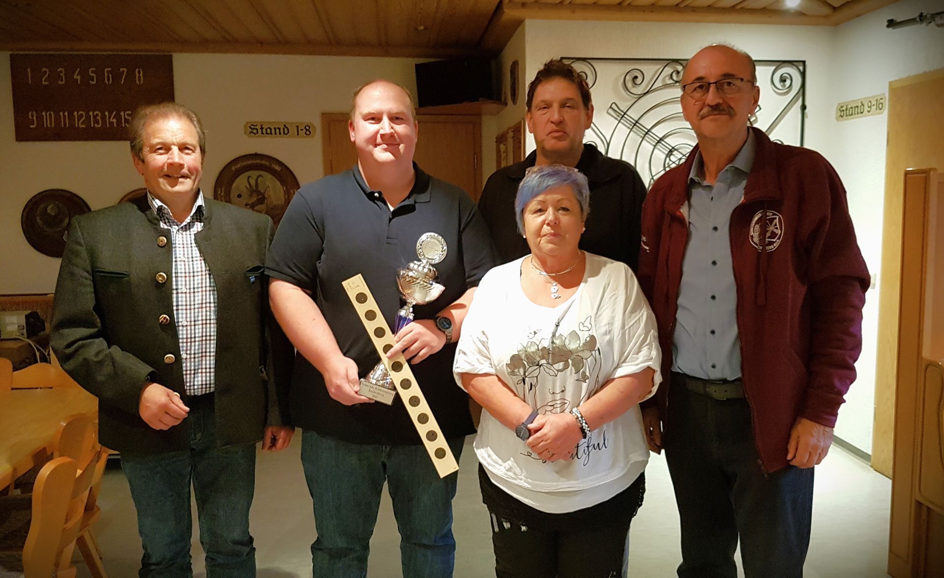 Brigitte Sattler (3. Platz), Schützenkönig Christian Weiß, Helmut Fritsch (2. Platz), 1. Schützenmeister Karl-Heinz Bickel,